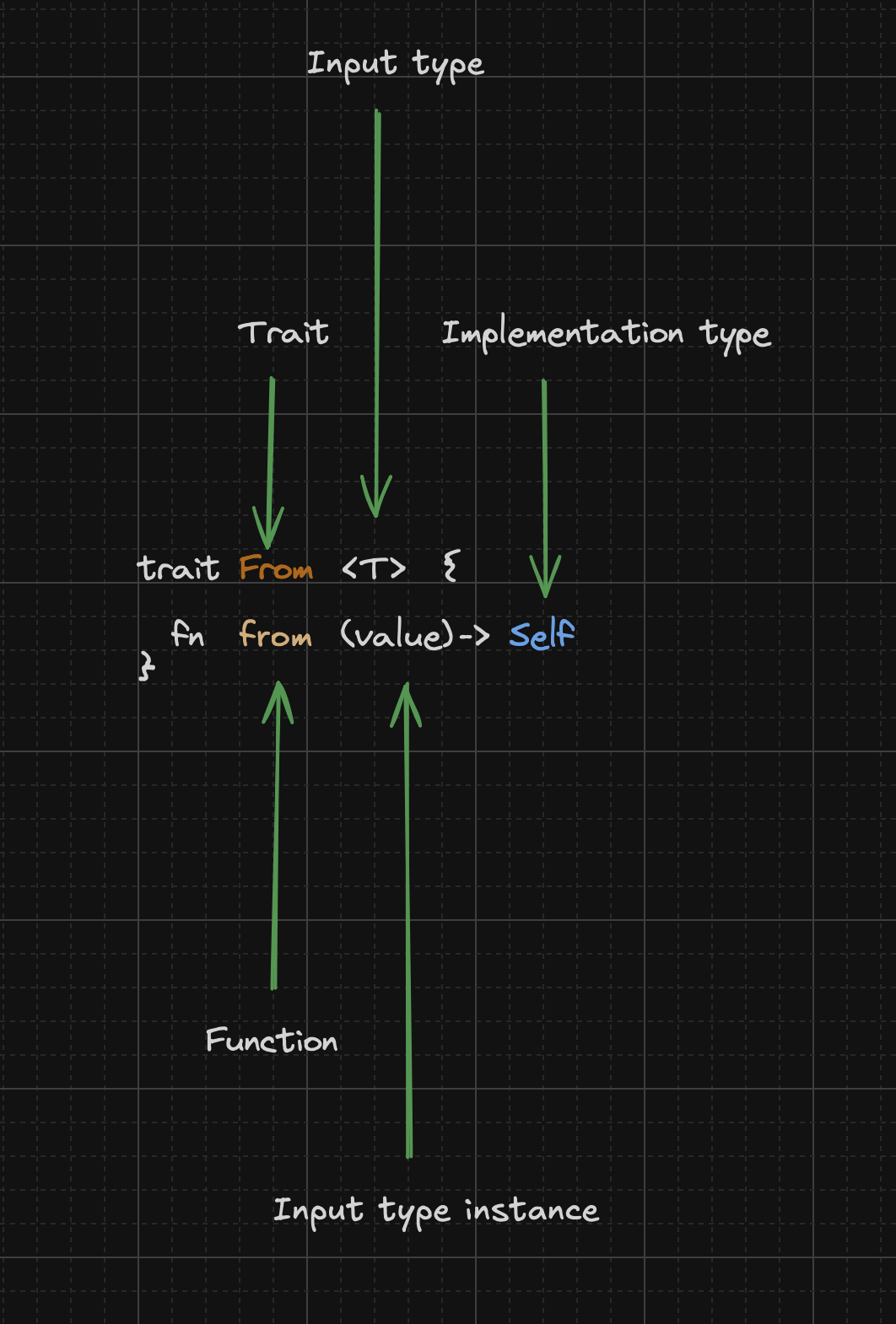 Using the above trait, we can convert from a value of some source type T to the implementing type (Self). The trait function